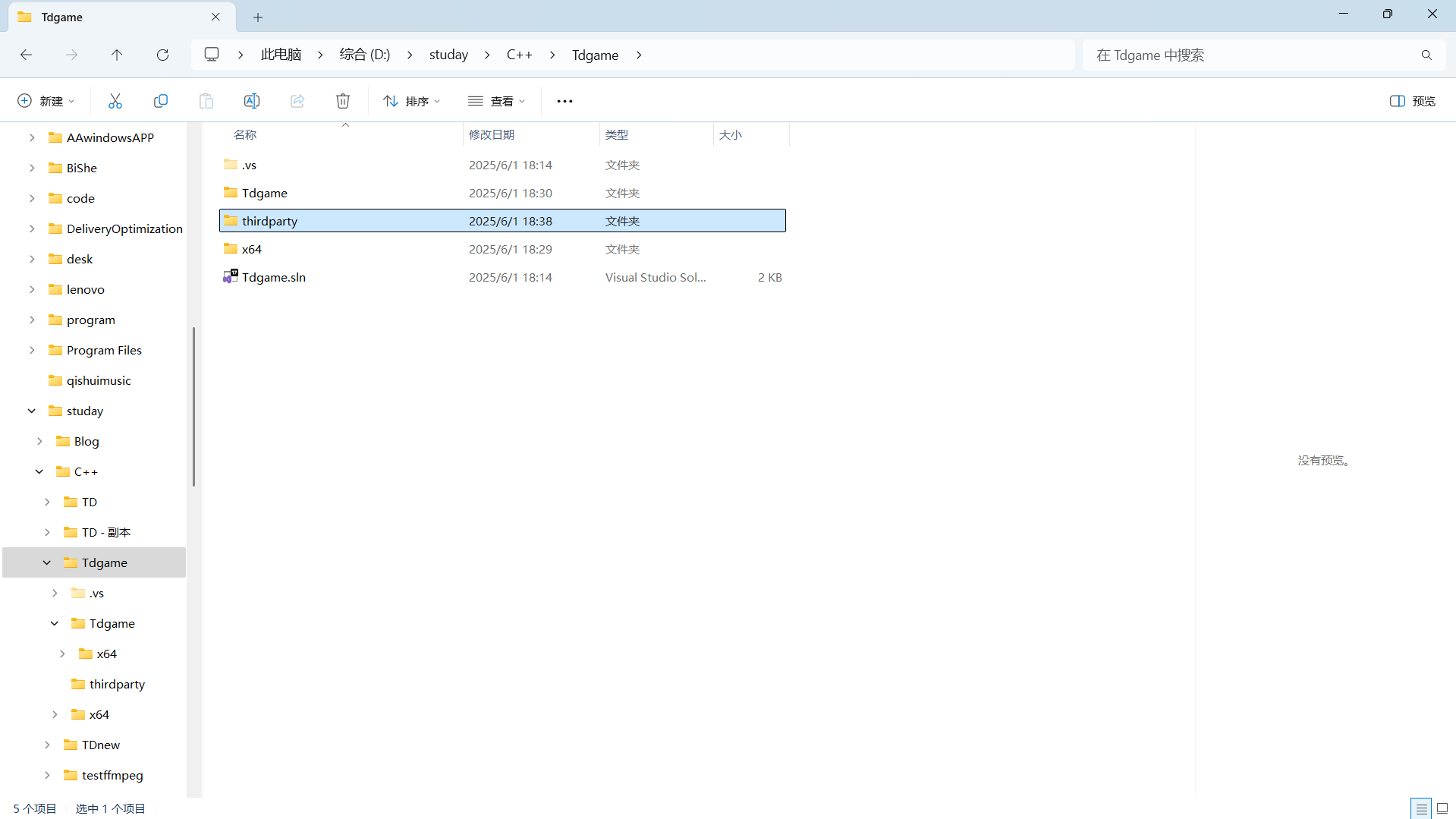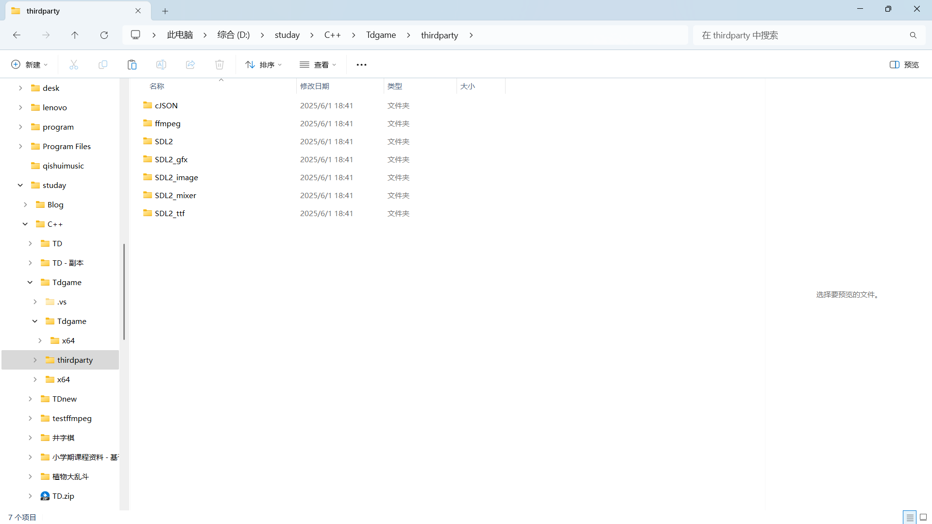右击项目,打开文件所在位置,然后返回文件夹上一级,新建文件夹thirdparty,然后将提供的SDL三方库文件复制到该文件夹。