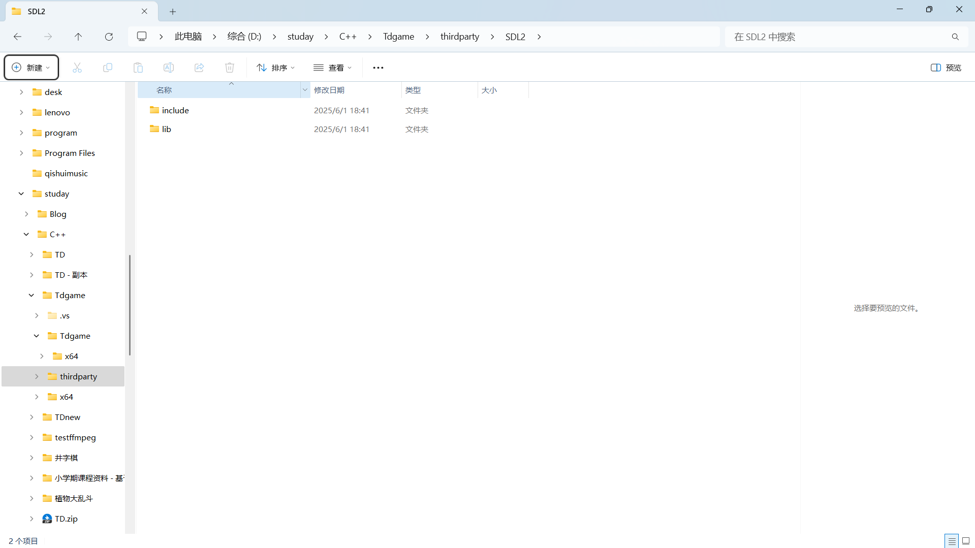 以SDL2文件为例,里面包含include和lib两个文件夹。