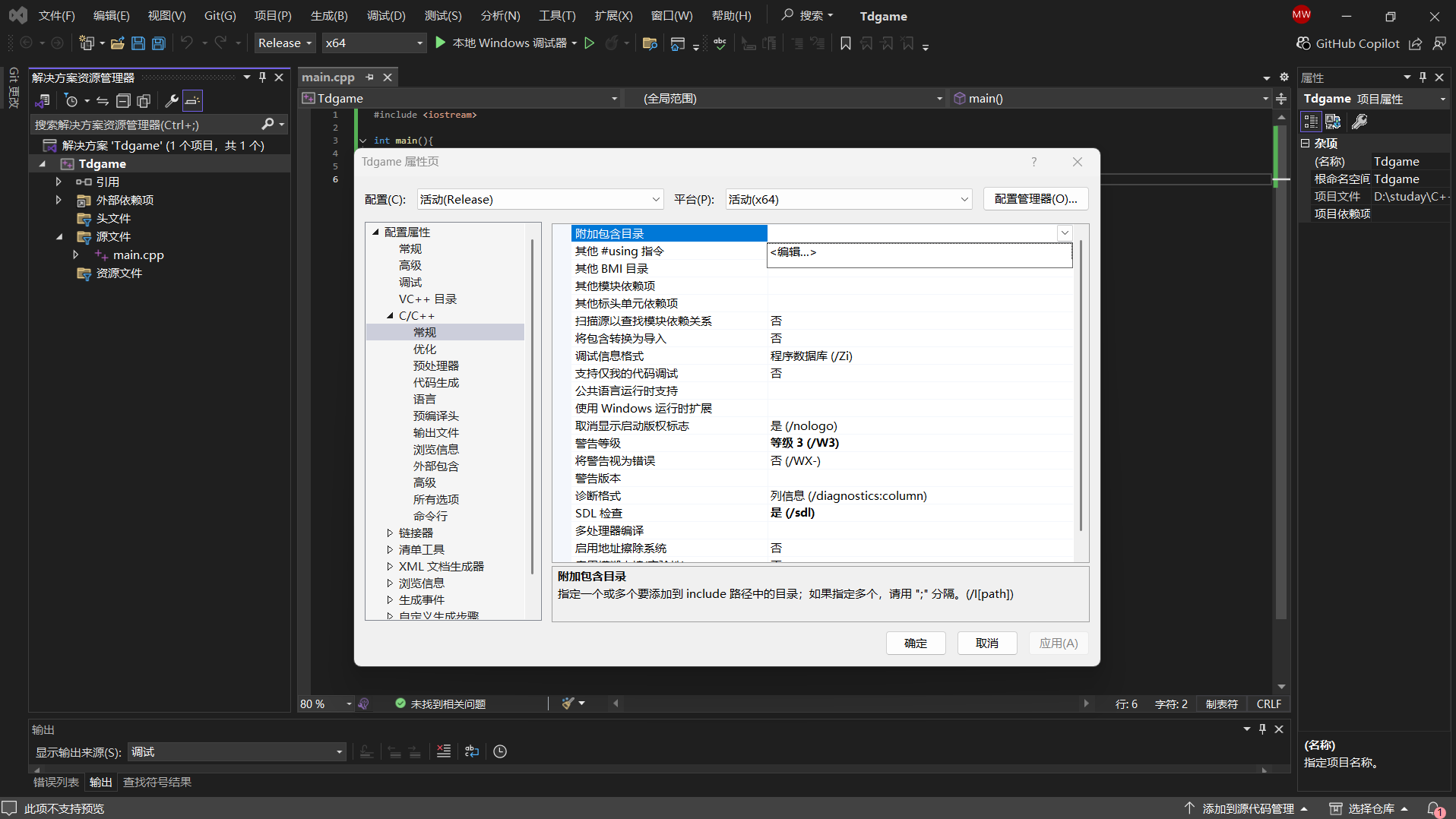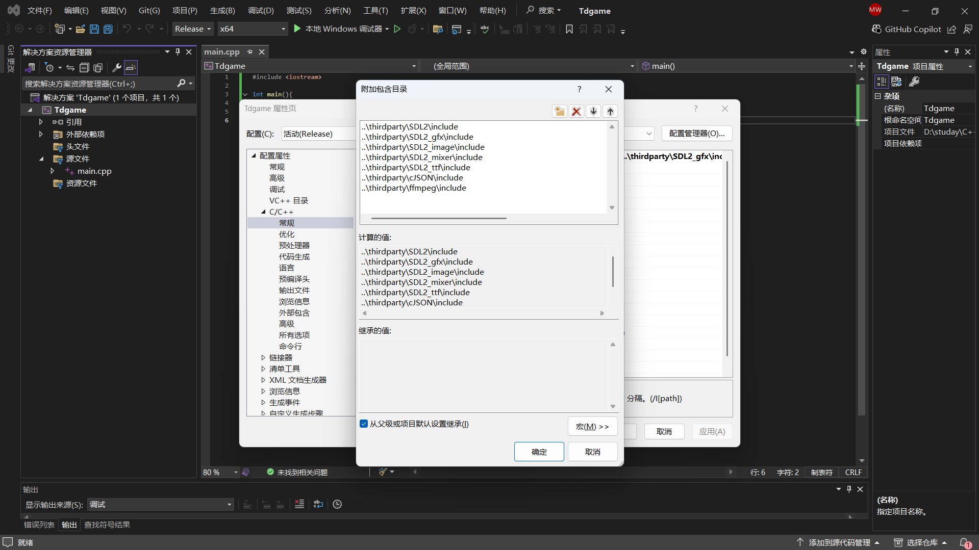 同样是打开项目属性页,在C/C++常规中选择附加包含目录,选择编辑输入各个三方库的include文件相对路径位置,然后选择应用。