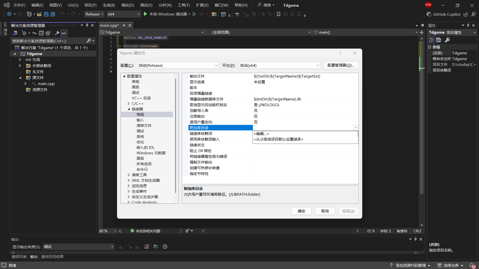 同样是打开项目属性页,在链接器常规中选择附加库目录,选择编辑输入各个三方库的lib文件相对路径位置,然后选择应用。