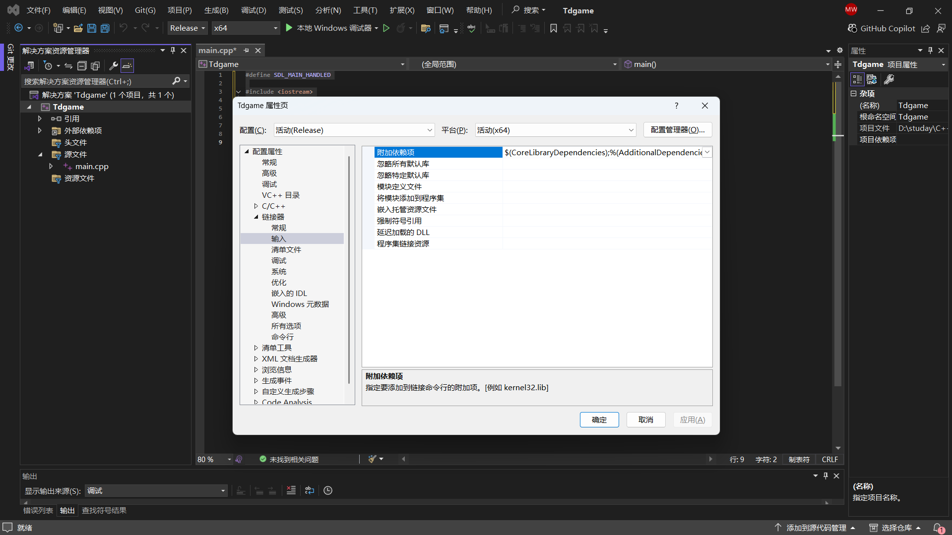 同样是打开项目属性页,在链接器输入中选择附加依赖项,选择编辑输入各个三方库的lib文件名称,然后选择应用。
