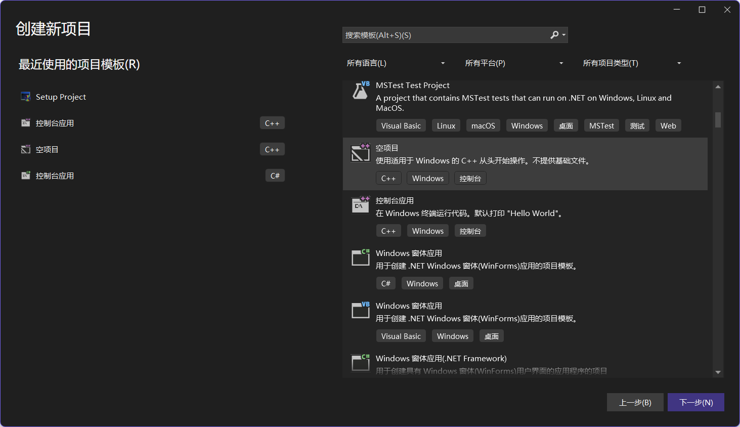 1.打开VS,选择创建新项目,然后选择创建空项目,自己命名后选择保存位置,然后选择创建。