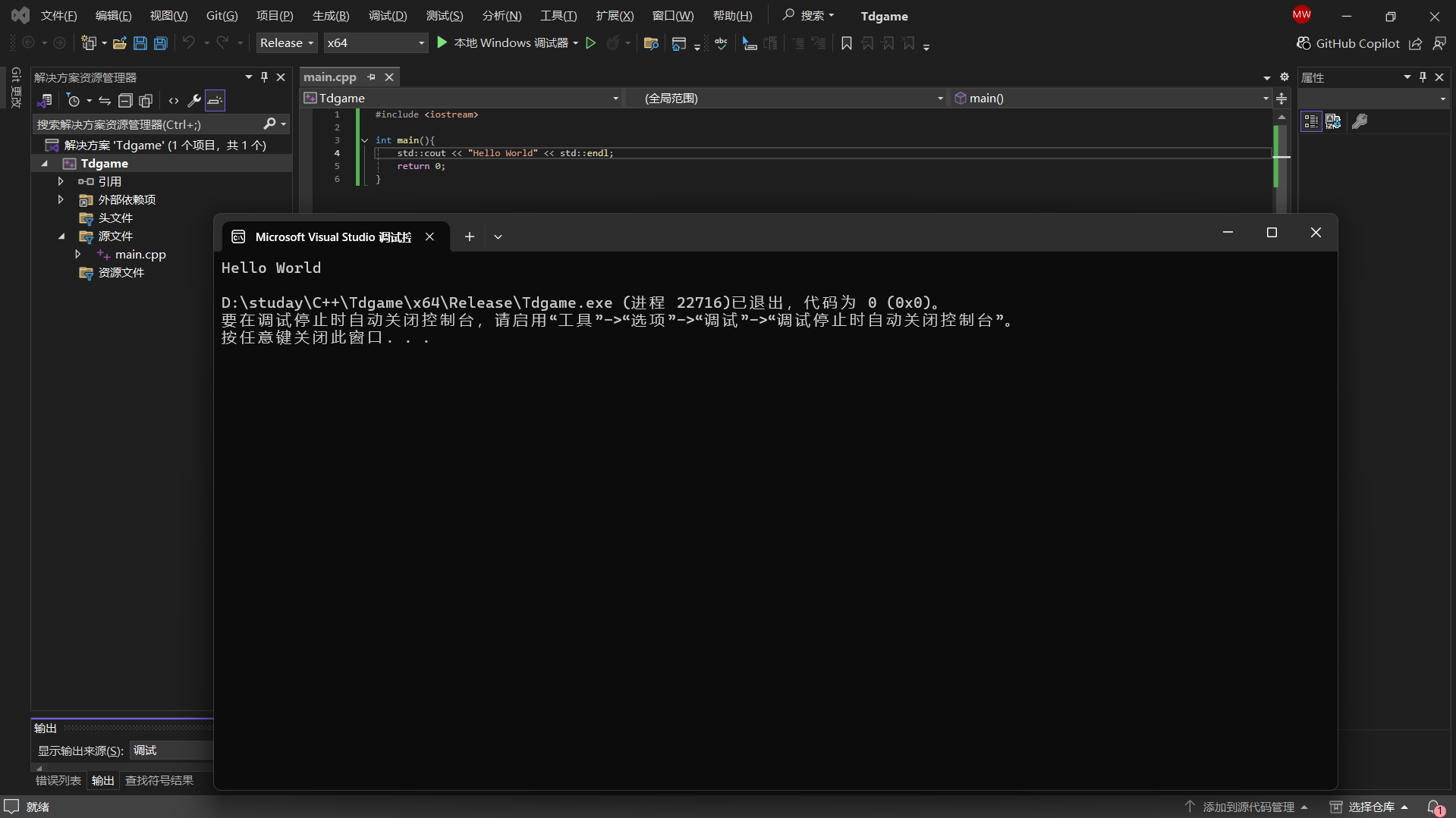 3.在main.cpp中输入下方代码,点击上方**“本地Windows调试器”**运行测试输出“Hello World”。
